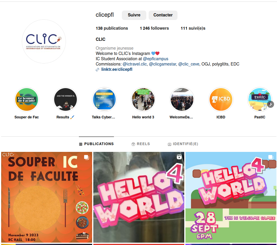 La insta page Instagram CLIC se doit de contenir un historique des événements ayant eu lieu tout au long de l'année académique dont vous êtes responsable. C'est pourquoi vous vous devez de publier chaque événement et information nécessaire afin de viser un grand nombre d'étudiants. Les stories vous permettront de rappeler de nombreuses informations utiles ou intéressantes pour les étudiants.